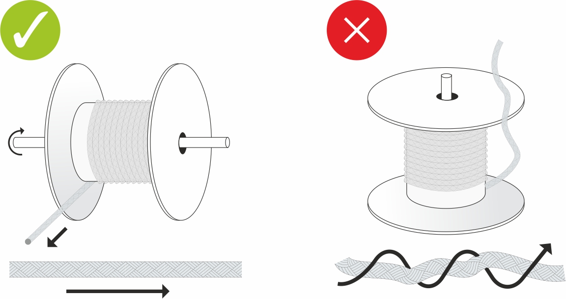 Make sure the rope is correctly unwound from the spool. If the rope unwinds from the spool from a vertical position, it twists. Twisting is prevented if the spool is in the correct, horizontal, position. Either brace the spool or use our spool cart .