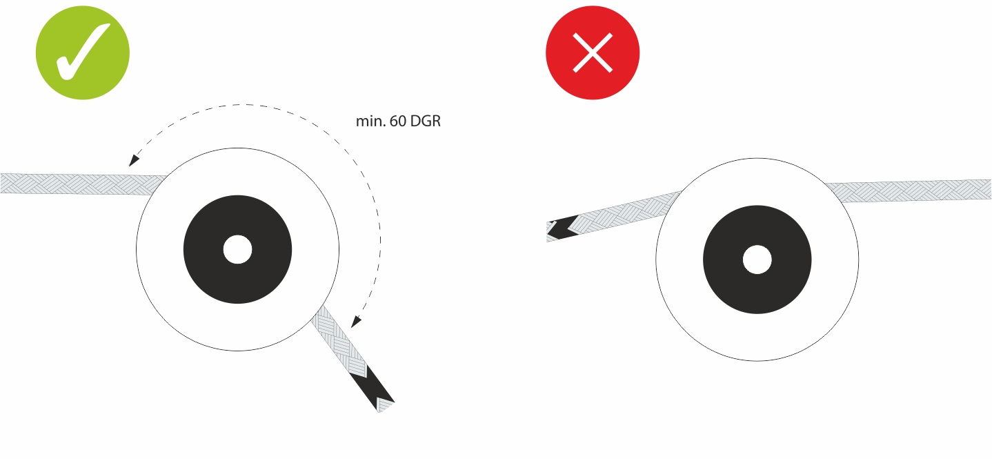 The required belting angle is at least 60° so that the pulley rotates at the speed of the rope. Otherwise, the rope may jam and burn.
