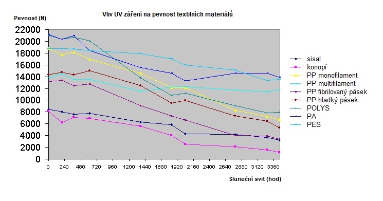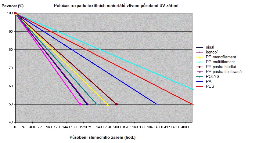 It is generally known that UV radiation has the least effect on polyester. However, by long-term measurements and testing our products - ropes made of various materials - we came to some interesting results: the smallest strength losses were found in ropes made of the polypropylene multifilament fibre MULTITEX, which was stabilized to 80 - 100 kLy as standard, see the effect of UV radiation on the strength of textile materials and the half-life.