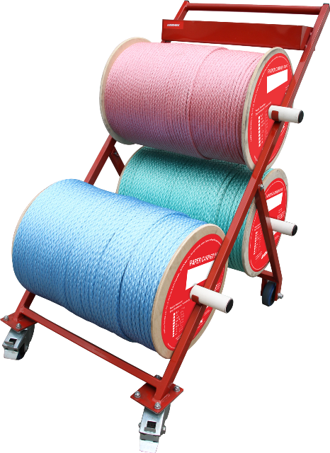 When feeding the ropes into the rope run, it is essential that the ropes are unwound in a horizontal direction. Vertical unwinding causes the rope to twist, which reduces its life. To ensure correct unwinding, LANEX supplies a specially designed holder / cart for 3 reels with paper carrier ropes.