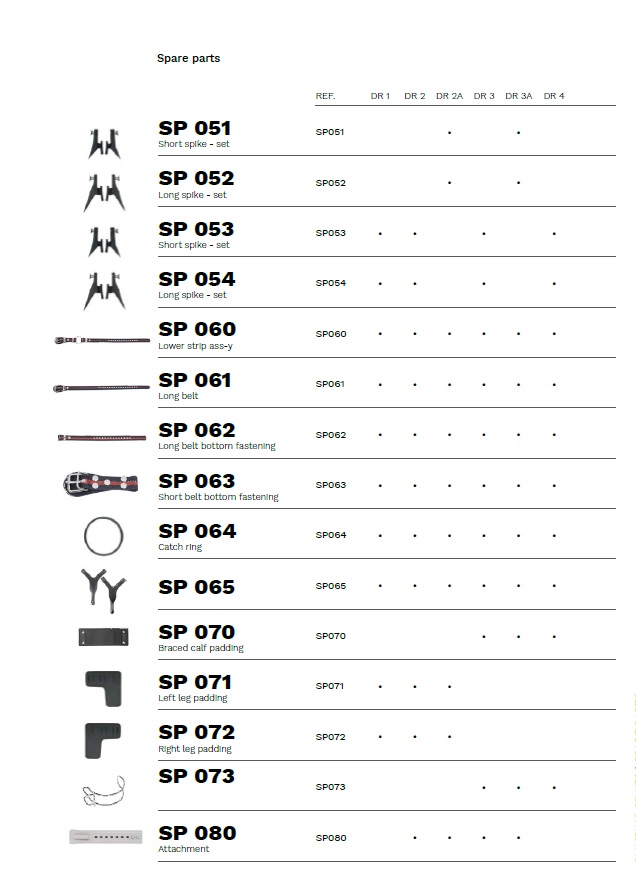 Spare parts are available if the strap breaks, the spikes or the protective pad become worn after long term use of the steel spikes.