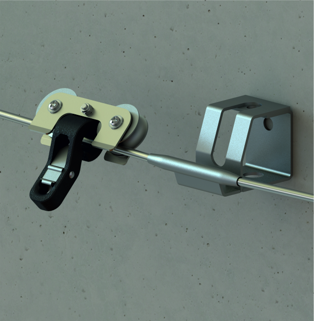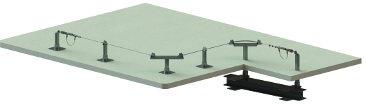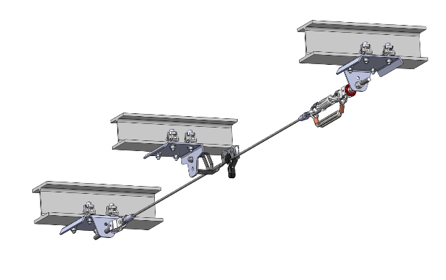 The system is designed for simultaneous use by one, two or three people. Optimally, the system can be configured for up to five users. The system consists of a horizontal guide line, which is made of stainless steel rope with a diameter of 8 mm, and is equipped with a fall damper and rope tensioner. Horizontal lines are connected to the structural anchor points of the permanent structure using posts or anchor plates.