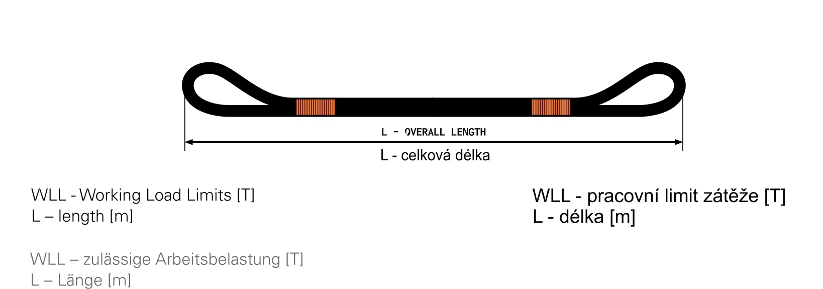Textile webbing is used especially in situations where use of other means (steel ropes, chains or textile ropes) could result in damage to the surface of the transported load. The webbings with different load bearing capacity have different colours for better identification. The greatest advantage of webbing with eyelets is adaptability to the suspension device and the possibility to use different types of securing of the load. Do not thread the webbing through textile eyelets. Strength is influenced, among other things, by the way of tying. The webbings are suitable for all lifting applications.